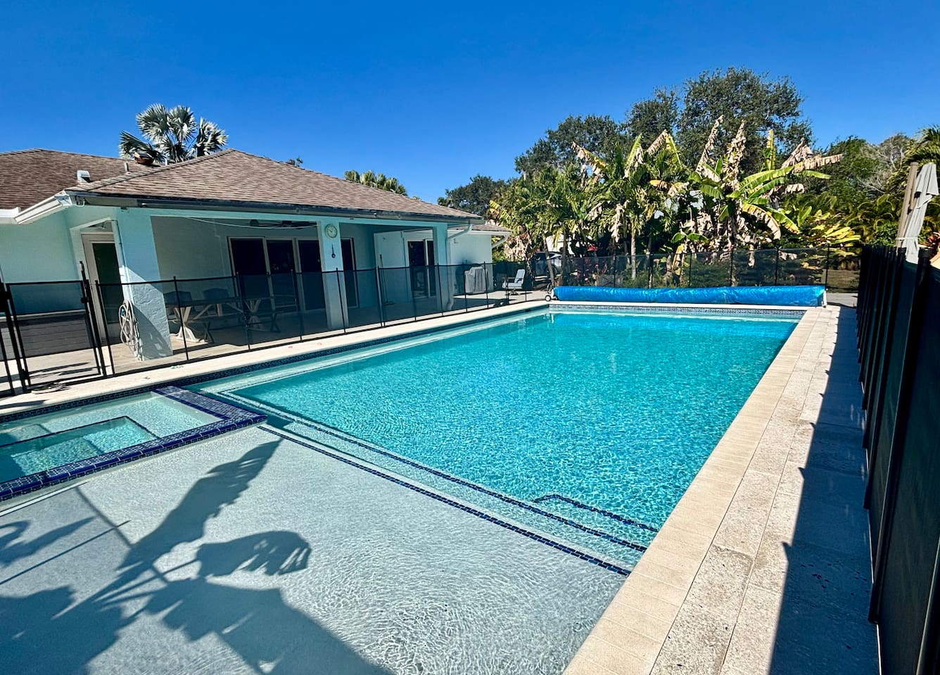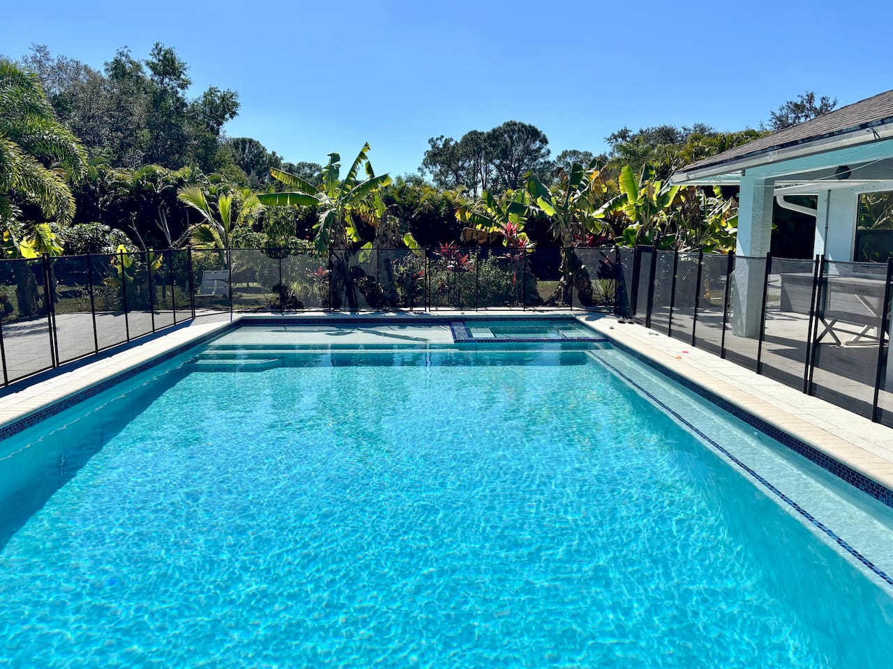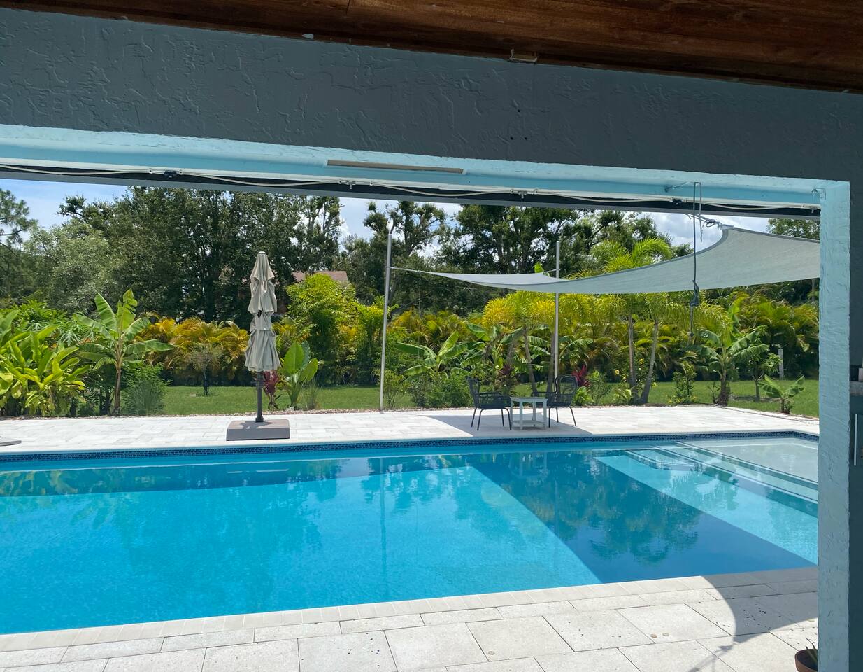 Modern 4 bedroom, 3 bathroom Jupiter Farms retreat with a huge resort-style heated pool, sun deck, loungers, umbrella, and baby safety fence. EV Charger! Oversized tropical yard with fire pit and outdoor dining. Renovated open floor plan with gourmet kitchen, large smart TV, and abundant natural light. Primary suite features glass sliders overlooking the pool and a walk-in shower. Huge yard for activities!