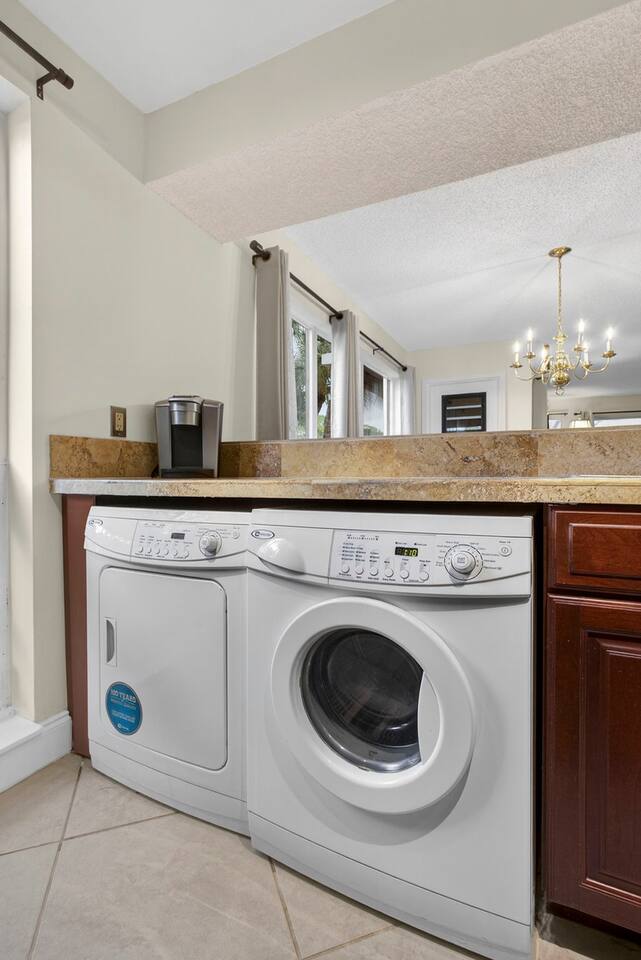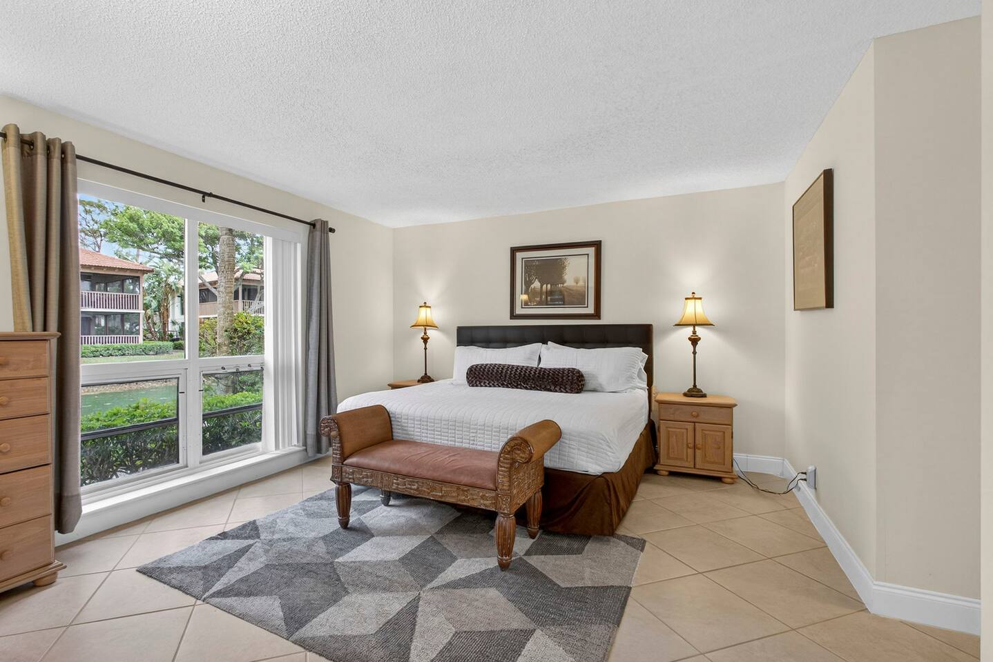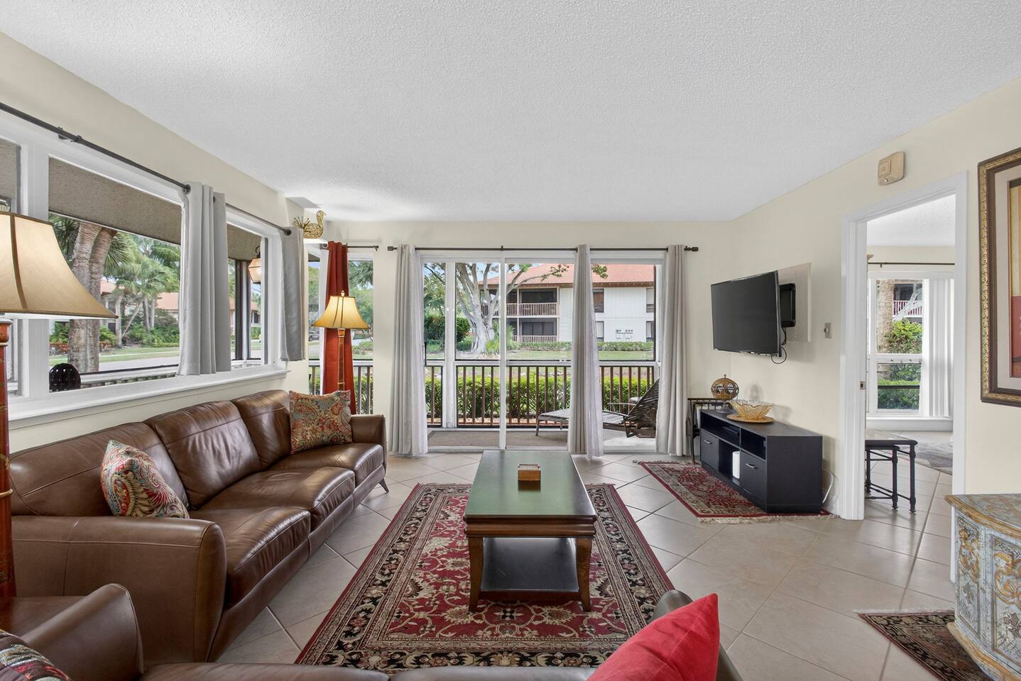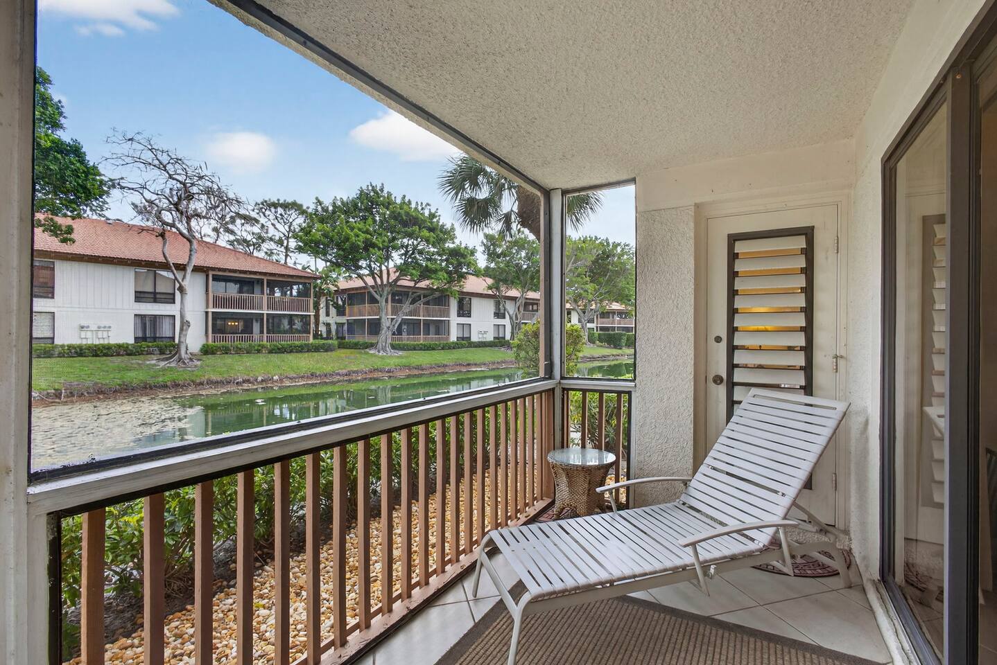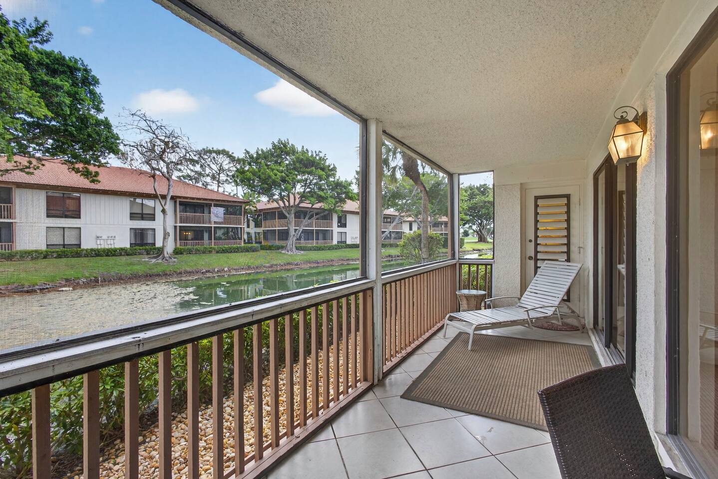 • Bright and spacious 2-bedroom, 2-bath first-floor Golf Villa • Enjoy peaceful canal views from the screened-in porch and lanai, ideal for morning coffee or evening relaxation • Newly renovated kitchen featuring granite countertops, stainless steel appliances, cherry cabinetry, and a fully stocked kitchen with everything you need to feel at home • Inviting living area with a comfortable sofa and flat-screen TV, perfect for unwinding after a day out • Both bedrooms offer king-size beds, flat-screen TVs, generous dresser space, and walk-in closets for a true retreat experience • Screened-in wraparound patio with cozy lounge seating for outdoor living • Access to a heated community pool for year-round enjoyment • Pet-friendly accommodations for one dog • Free parking conveniently located directly in front of the unit • Fresh linens and towels provided for your stay • Complimentary high-speed Wi-Fi