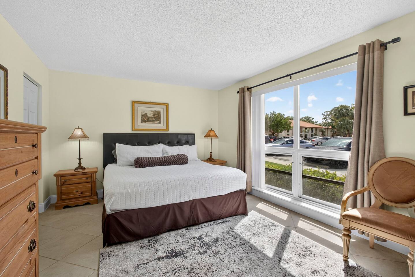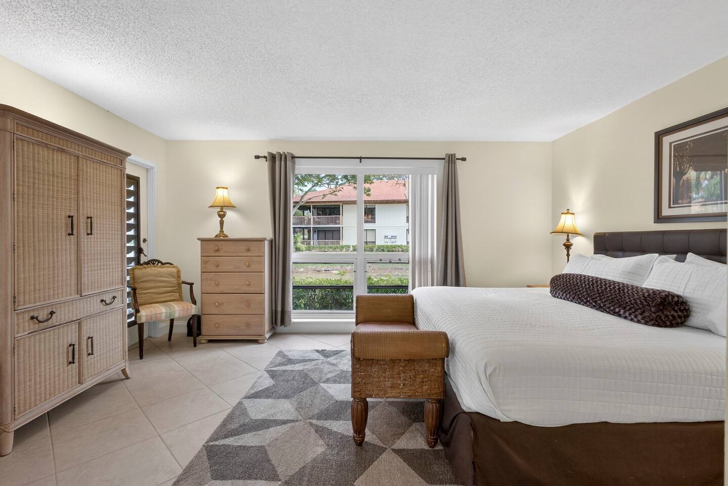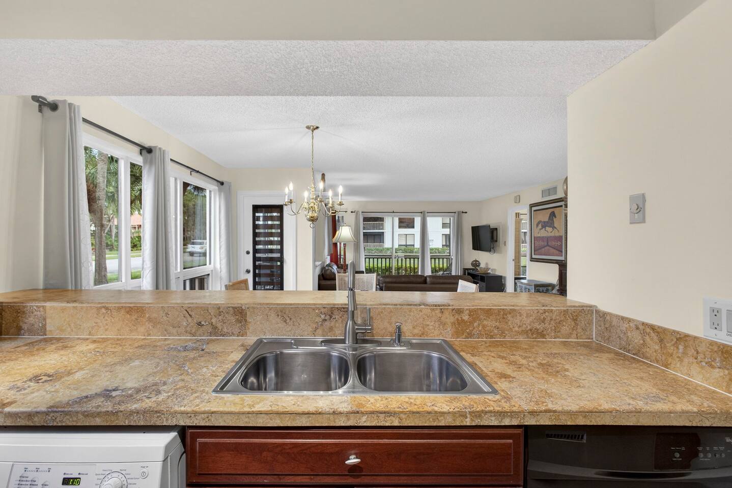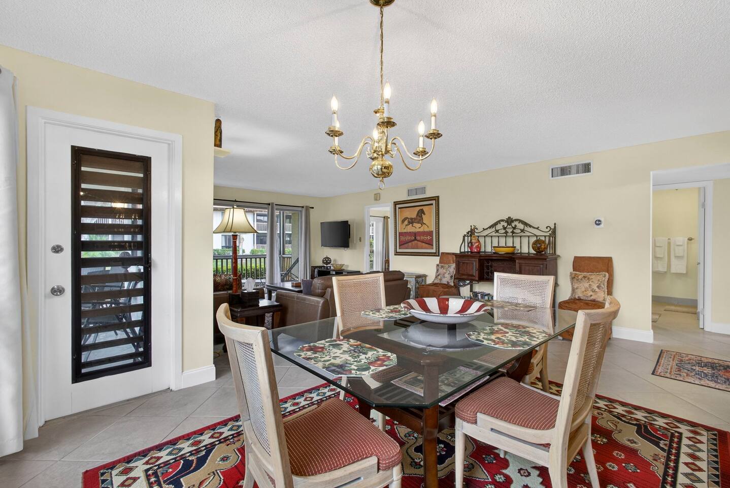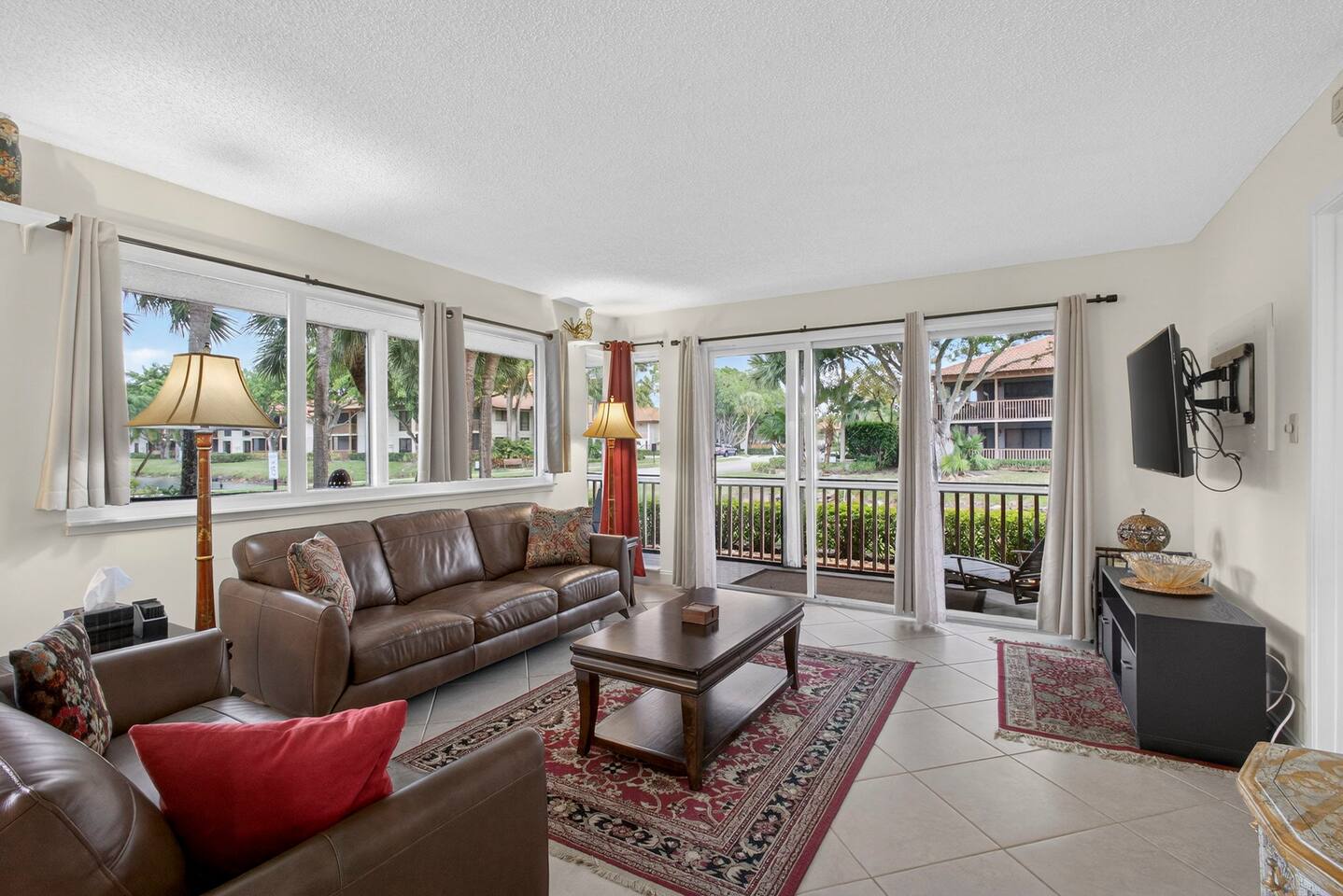 • Bright and spacious 2-bedroom, 2-bath first-floor Golf Villa • Enjoy peaceful canal views from the screened-in porch and lanai, ideal for morning coffee or evening relaxation • Newly renovated kitchen featuring granite countertops, stainless steel appliances, cherry cabinetry, and a fully stocked kitchen with everything you need to feel at home • Inviting living area with a comfortable sofa and flat-screen TV, perfect for unwinding after a day out • Both bedrooms offer king-size beds, flat-screen TVs, generous dresser space, and walk-in closets for a true retreat experience • Screened-in wraparound patio with cozy lounge seating for outdoor living • Access to a heated community pool for year-round enjoyment • Pet-friendly accommodations for one dog • Free parking conveniently located directly in front of the unit • Fresh linens and towels provided for your stay • Complimentary high-speed Wi-Fi