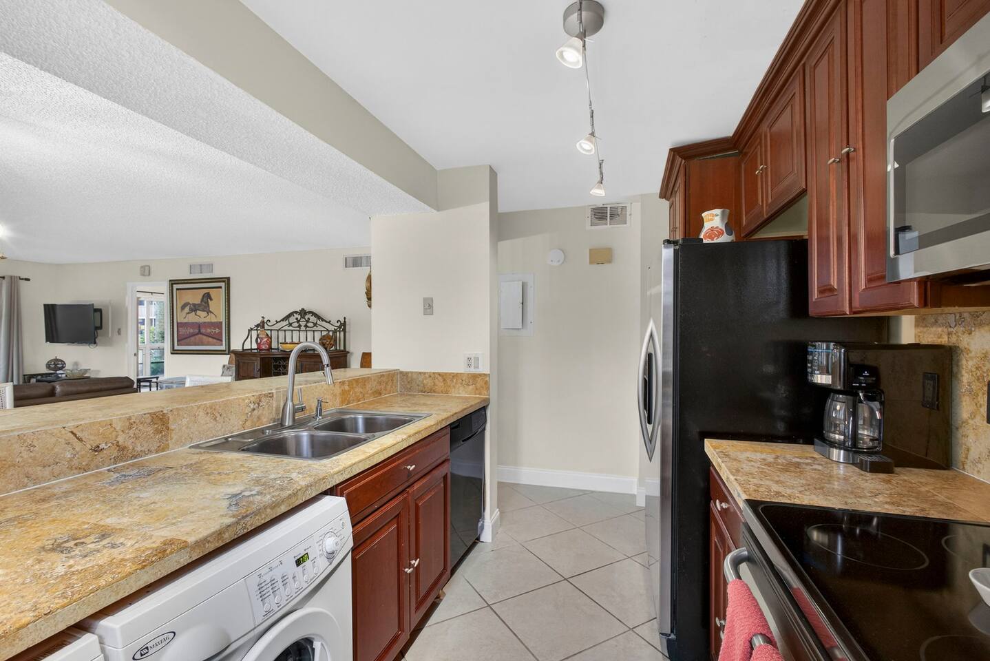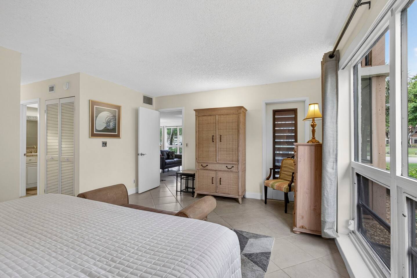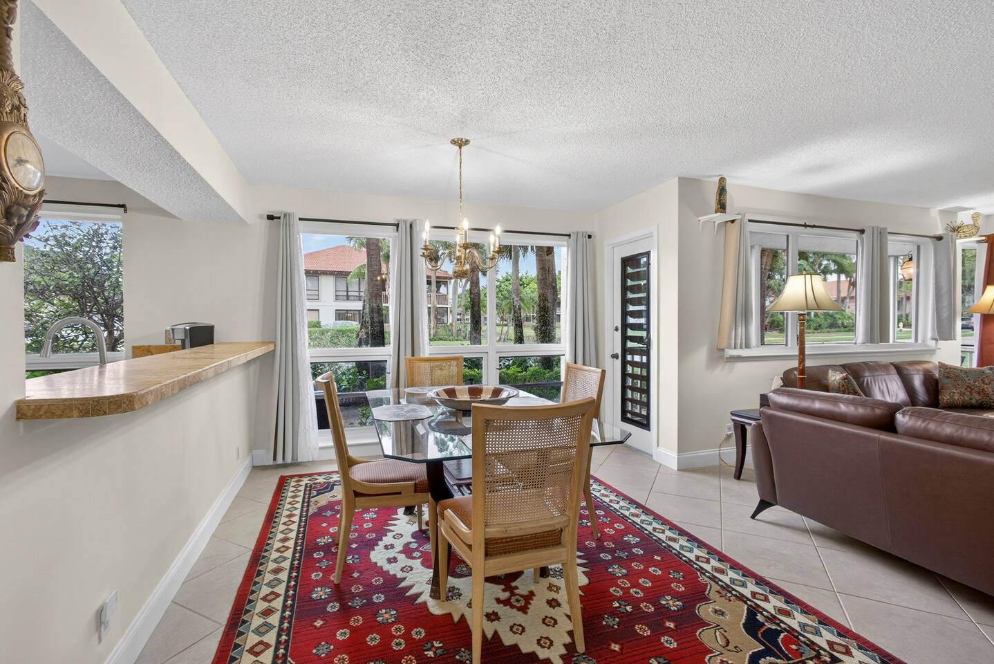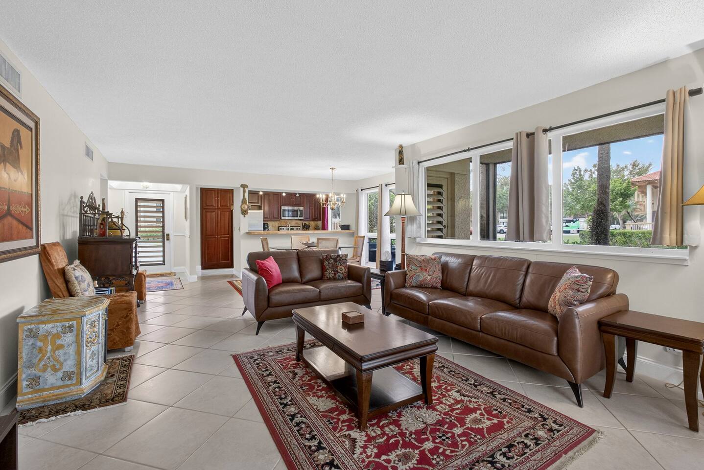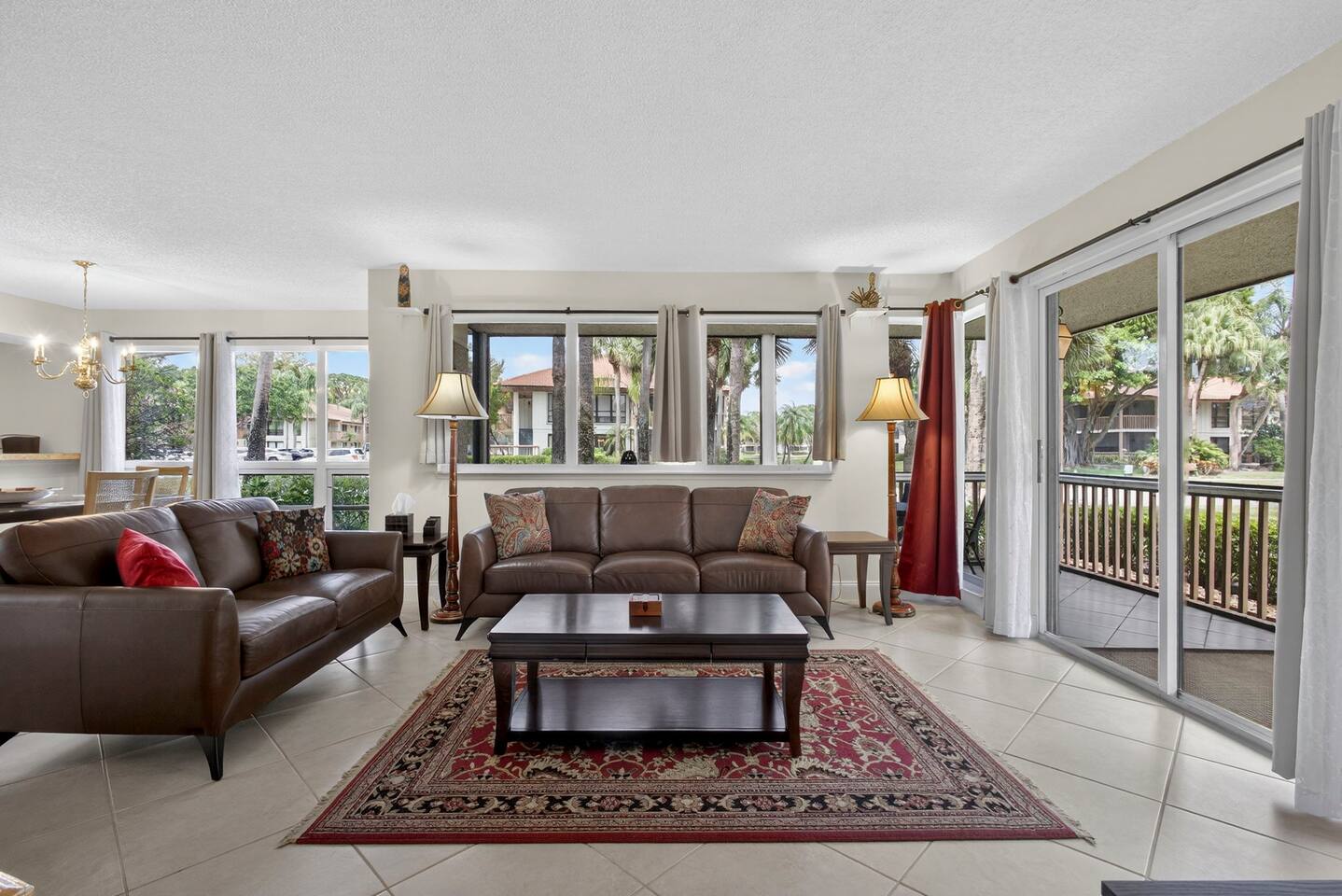 • Bright and spacious 2-bedroom, 2-bath first-floor Golf Villa • Enjoy peaceful canal views from the screened-in porch and lanai, ideal for morning coffee or evening relaxation • Newly renovated kitchen featuring granite countertops, stainless steel appliances, cherry cabinetry, and a fully stocked kitchen with everything you need to feel at home • Inviting living area with a comfortable sofa and flat-screen TV, perfect for unwinding after a day out • Both bedrooms offer king-size beds, flat-screen TVs, generous dresser space, and walk-in closets for a true retreat experience • Screened-in wraparound patio with cozy lounge seating for outdoor living • Access to a heated community pool for year-round enjoyment • Pet-friendly accommodations for one dog • Free parking conveniently located directly in front of the unit • Fresh linens and towels provided for your stay • Complimentary high-speed Wi-Fi