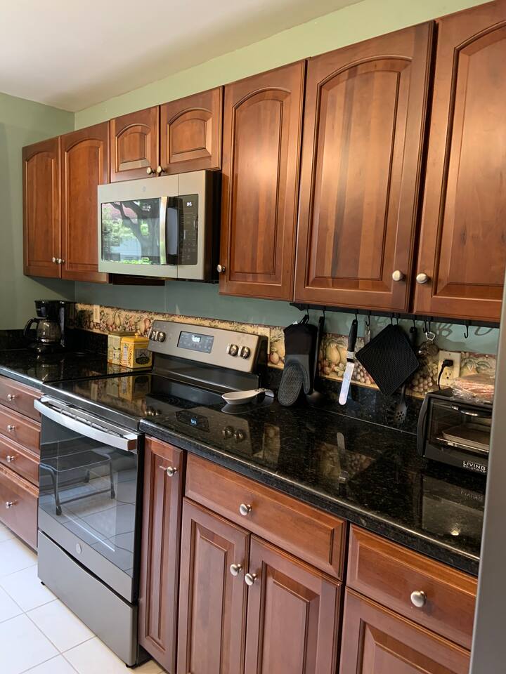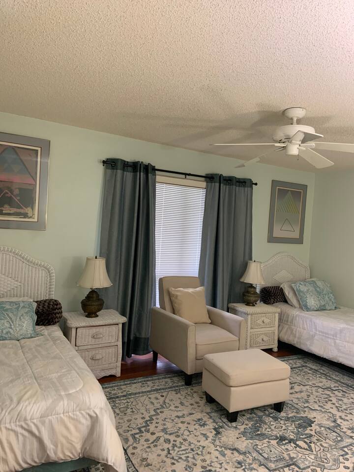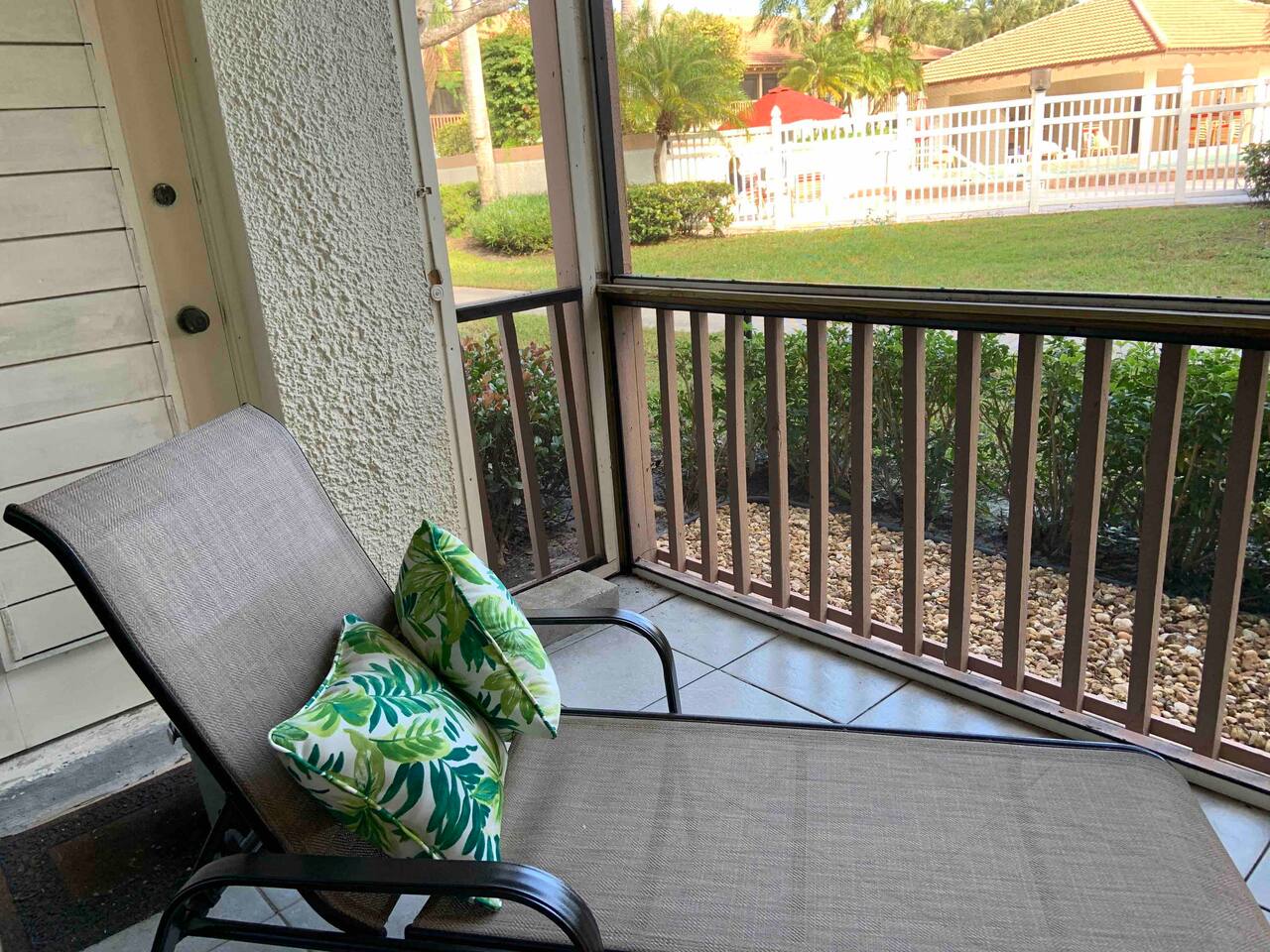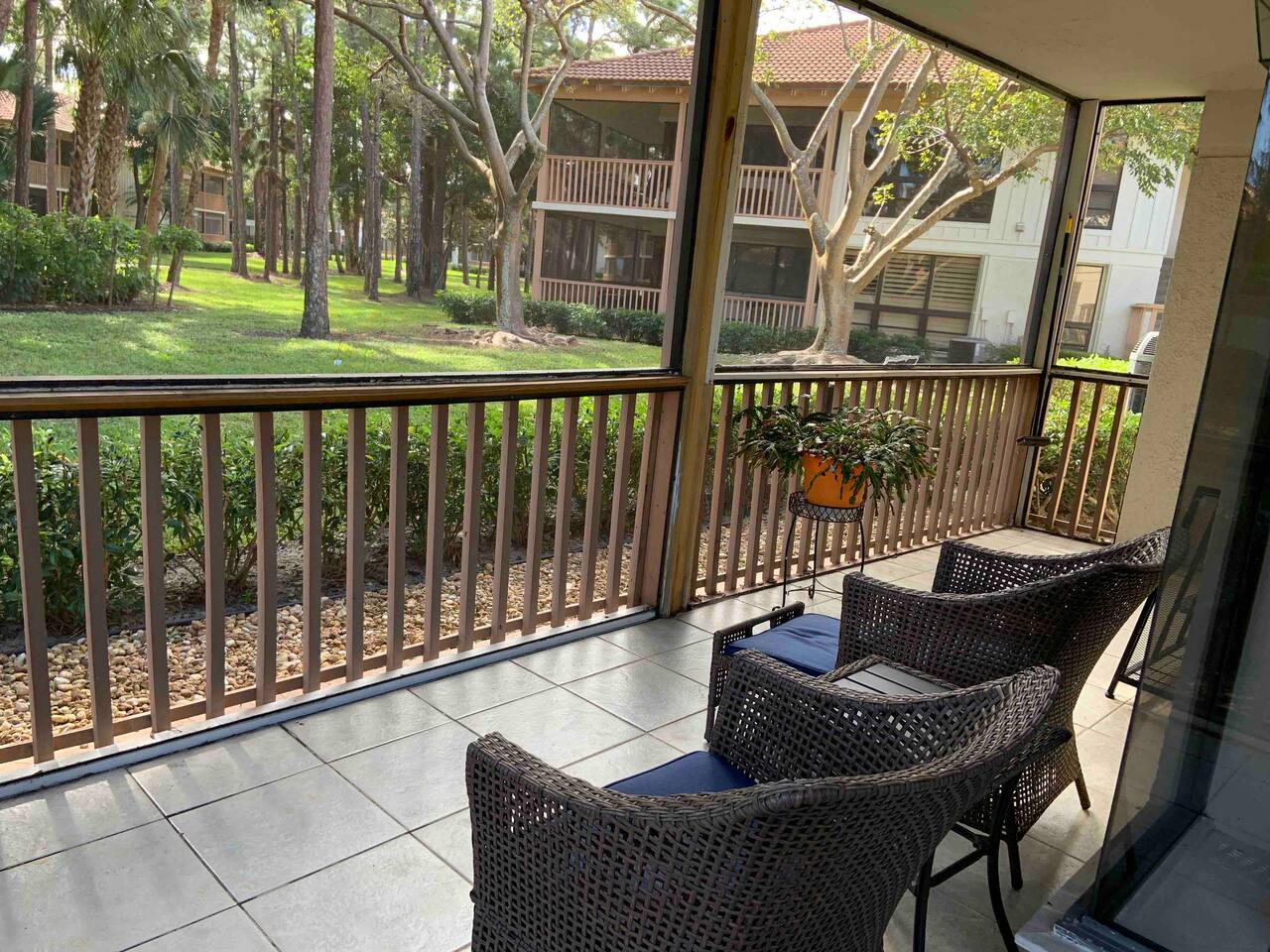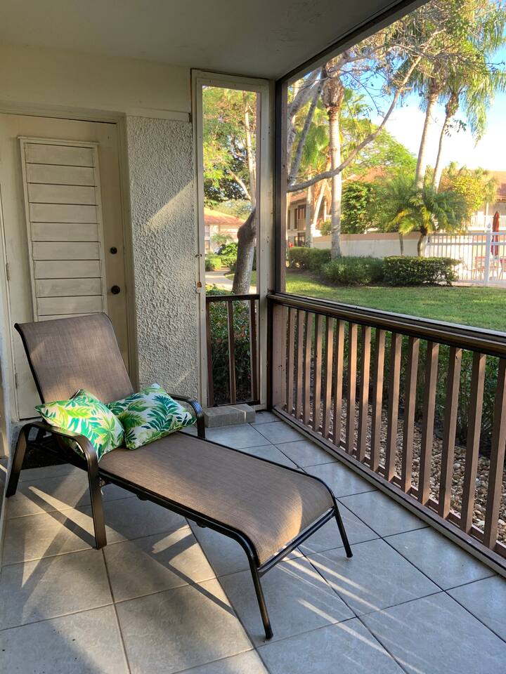 2 bedroom, 2 bathroom first floor • Wrap around screened in porch, steps from the community pool • Nicely appointed kitchen with brand new “slate” color GE appliances, granite counter tops and oak cabinets with all the necessities • Comfortable living room area, cozy dining area • King size bed, flat screen TV, dresser, desk, storage spaces and walk-in closet in the master bedroom • Two twin beds, flat screen TV, dresser storage spaces and walk-in closet in second bedroom