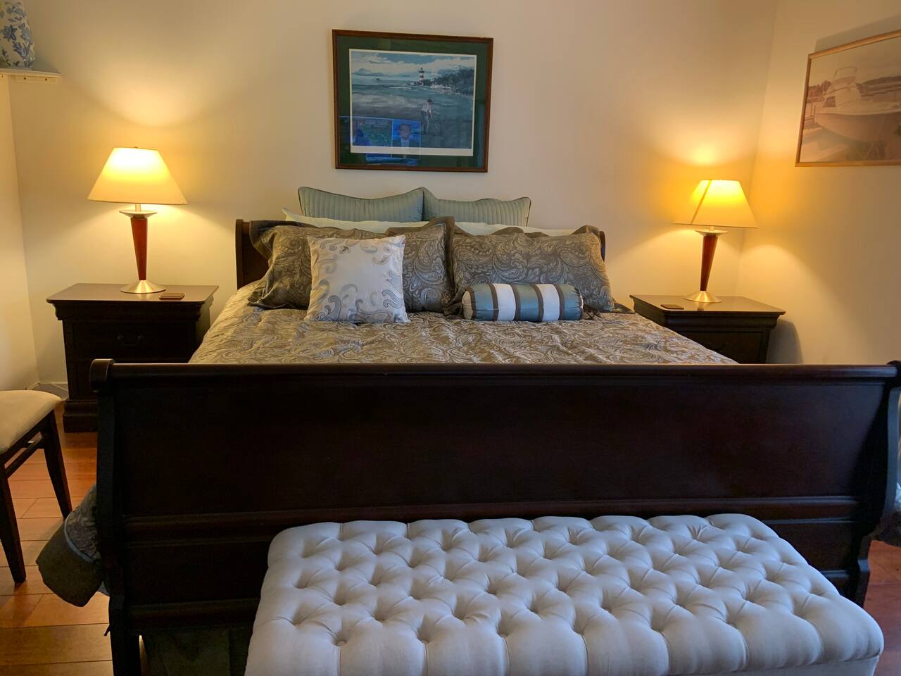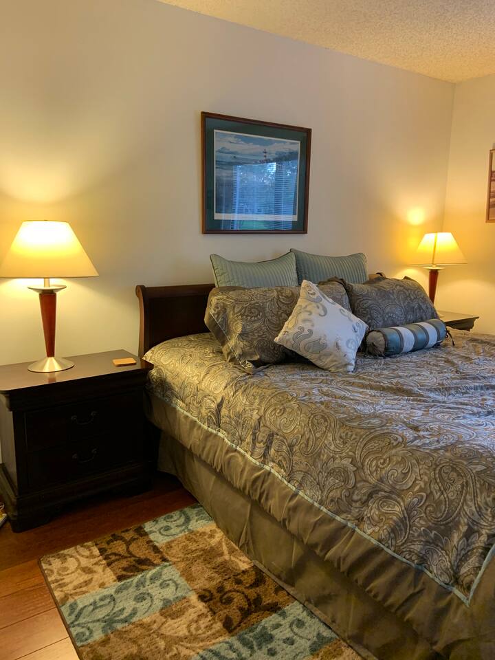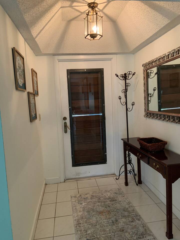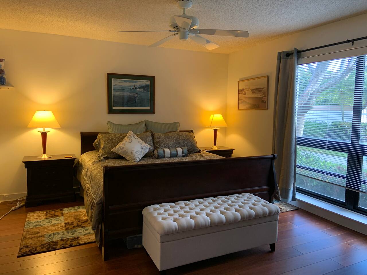 • Bright and spacious 2-bedroom, 2-bath first-floor Golf Villa • Enjoy peaceful canal views from the screened-in porch and lanai, ideal for morning coffee or evening relaxation • Newly renovated kitchen featuring granite countertops, stainless steel appliances, cherry cabinetry, and a fully stocked kitchen with everything you need to feel at home • Inviting living area with a comfortable sofa and flat-screen TV, perfect for unwinding after a day out • Both bedrooms offer king-size beds, flat-screen TVs, generous dresser space, and walk-in closets for a true retreat experience • Screened-in wraparound patio with cozy lounge seating for outdoor living • Access to a heated community pool for year-round enjoyment • Pet-friendly accommodations for one dog • Free parking conveniently located directly in front of the unit • Fresh linens and towels provided for your stay • Complimentary high-speed Wi-Fi
