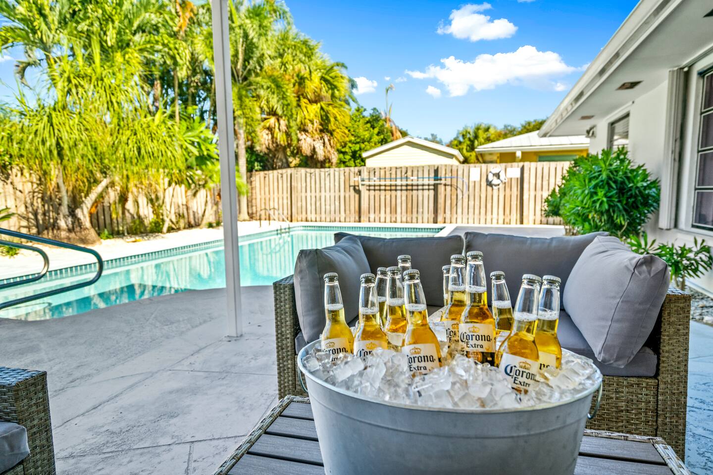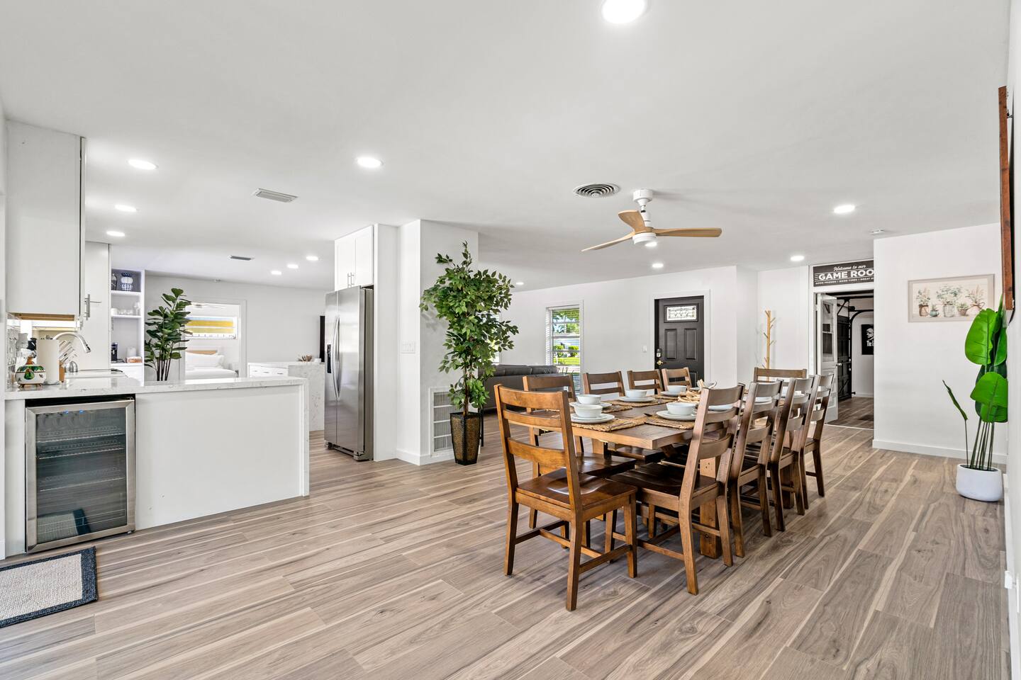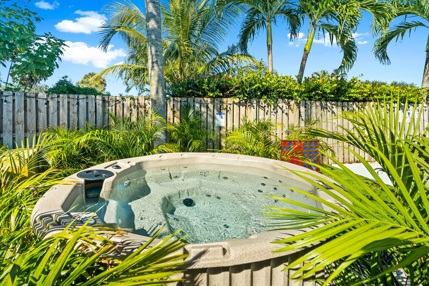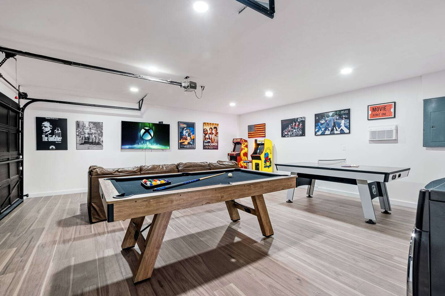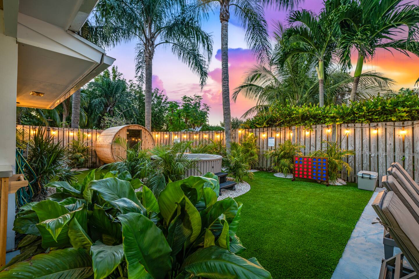 Our tropical retreat exudes a coastal charm with earthy tones and coastal-inspired decor. Recently renovated with four private bedrooms (with privacy locks) and 8 beds, we can accommodate up to 11 guests. The house's theme is centered around entertainment, health and wellness (did we mention we have a Game Room in the garage?), promoting a balanced and relaxing environment for our guests. The tropical backyard retreat is fenced in with a covered patio and lounge chairs for sunbathing next to the FREE HEATED POOL, HOT TUB, SAUNA, BBQ Grill, Outdoor TV and COLD PLUNGE. Enjoy cocktails by the pool with plenty of shade or sun- whichever you prefer! Inside the retreat, an 85-inch smart TV is a central fixture in the expansive open-floor-plan (kitchen, living room, and dining room are all one open space), with access to Xfinity cable and streaming apps. The large dining room table can seat ten guests. There is a private laundry inside the garage Game Room with a brand new washer and dryer. We provide laundry detergent, dryer sheets, and an iron and ironing board. The garage Game Room features a big-screen TV, Xbox, pool table, ping pong, air hockey, and two arcade video game cabinets! Brand new central air conditioning and ceiling fans in every room keep the space cool, even during Florida’s hottest months, and our large ice machine on the patio is perfect for getting the cold plunge ready or keeping your drinks chilled on ice! We do allow up to 2 dogs. Please indicate at booking, and include the pet fee in your reservation. There is a smart lock for the front door for an easy self-check-in process. BEDROOMS: The Master Suite has a luxurious, plush king-size bed and ensuite private bathroom with a walk-in closet. The Master Bathroom has a double sink vanity and a large overhead rain shower with plenty of pressure. The two (2) Queen bedrooms feature cozy and extremely comfortable queen-sized beds, ideal for couples or solo travelers. The main bathroom has a shower with a tub and a large sink area. The Bunk Room is perfect for the kids or a group of friends, with five comfy beds (two bunk beds and a pull-out trundle). KITCHEN & INDOOR AMENITIES: The open kitchen has been updated with a new large kitchen island with barstools and Quartz counters. We have all the dishes, cups and glasses, utensils, cookware, appliances, coffee maker, blenders, etc. Our cleaning team leaves you with a 5-star "hotel quality" finish (just check our reviews!), providing all sheets, pillows, towels, plenty of beach towels, laundry detergent pods, dishwashing pods, paper towels, toilet paper, hand soap, dish soap, plates, bowls, glasses, etc. If you are missing something that can make your stay more enjoyable, please do not hesitate to ask! OUTDOOR AMENITIES: Step into the backyard, where a private Bali-inspired paradise awaits! Relax and rejuvenate in the sparkling pool, soak up the Florida sun on the comfortable lounge furniture, or unwind in the hot tub. For those seeking wellness, our sauna and cold plunge offer the perfect way to detox and refresh your body. An outdoor shower adds a touch of convenience after a dip in the pool or a day at the beach. Don't forget, you can enjoy the game by the pool on our large outdoor smart TV! ENTERTAINMENT: The Game Room in the garage is a haven for entertainment enthusiasts, featuring a big-screen TV, Xbox video game system, pool table, ping pong/air hockey, and arcade video game cabinets. We have numerous board games for the whole family. Hours of fun await you and your guests right at home! LOCATION: Nestled in Palm Beach Gardens, you'll have easy access to pristine beaches, world-class golf courses, shopping, dining, and various outdoor activities. Spring training is just a stone’s throw away! The best of Palm Beach Island is also at your fingertips... Whether you're seeking relaxation or adventure, our Palm Beach Gardens Retreat offers the ideal space to create lasting memories with family and friends. Book your stay today and experience the perfect blend of health, wellness, and fun in paradise!