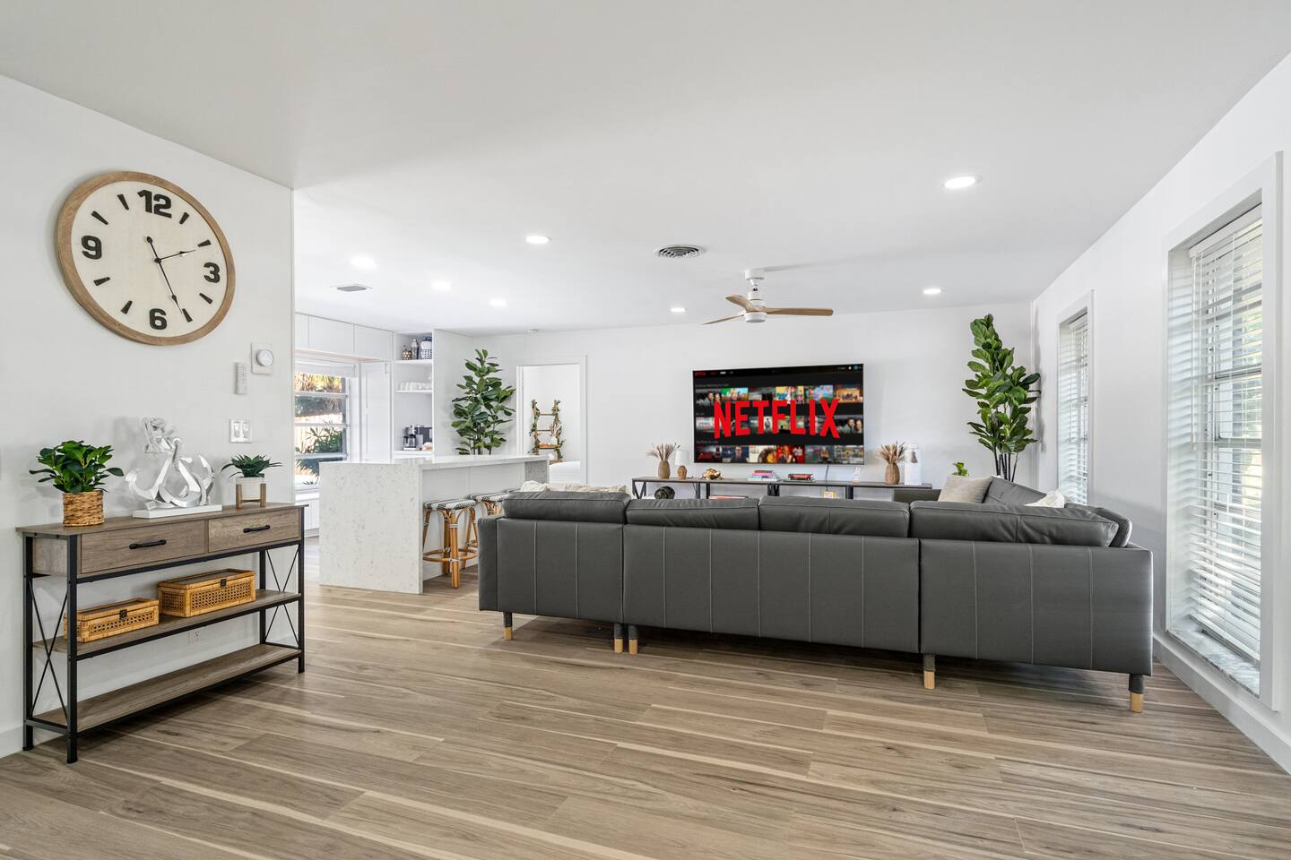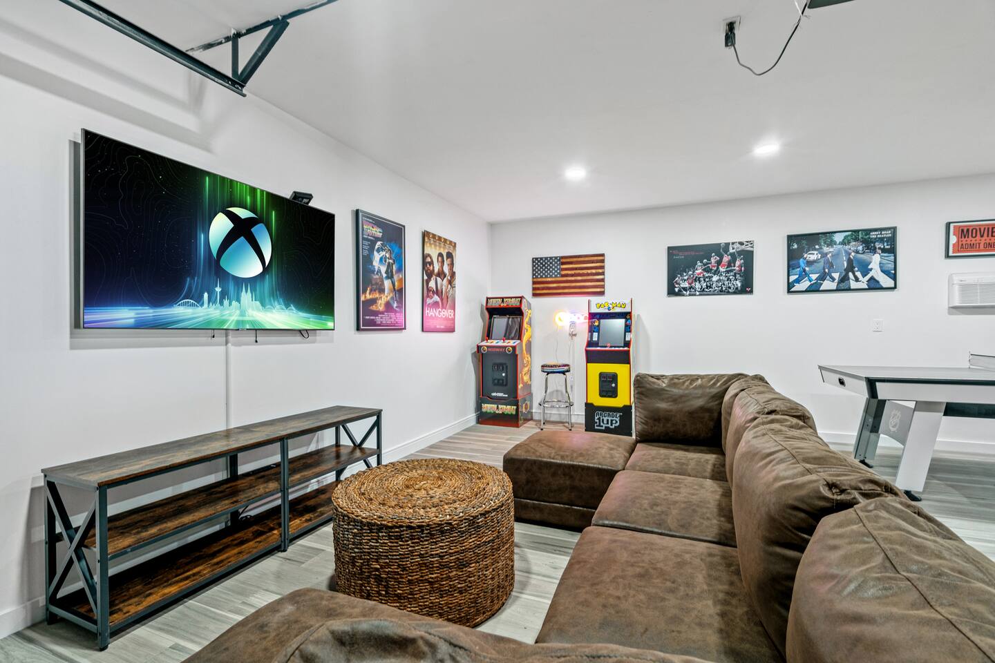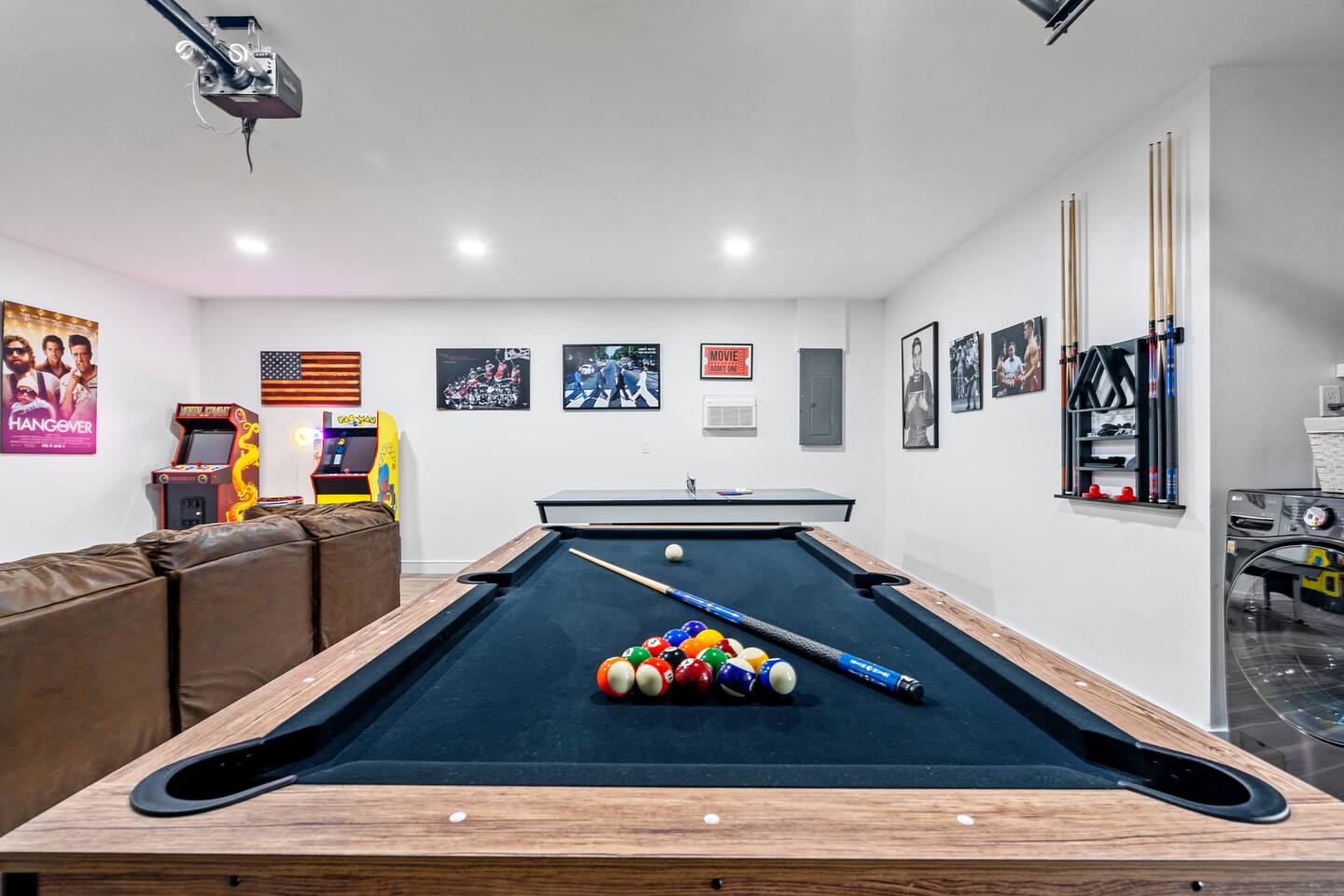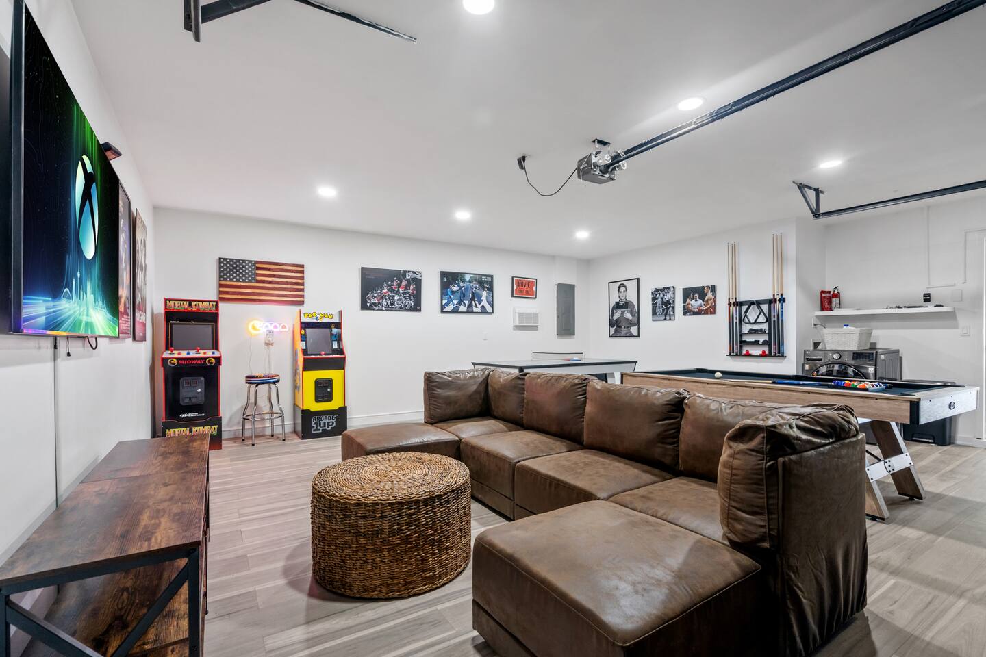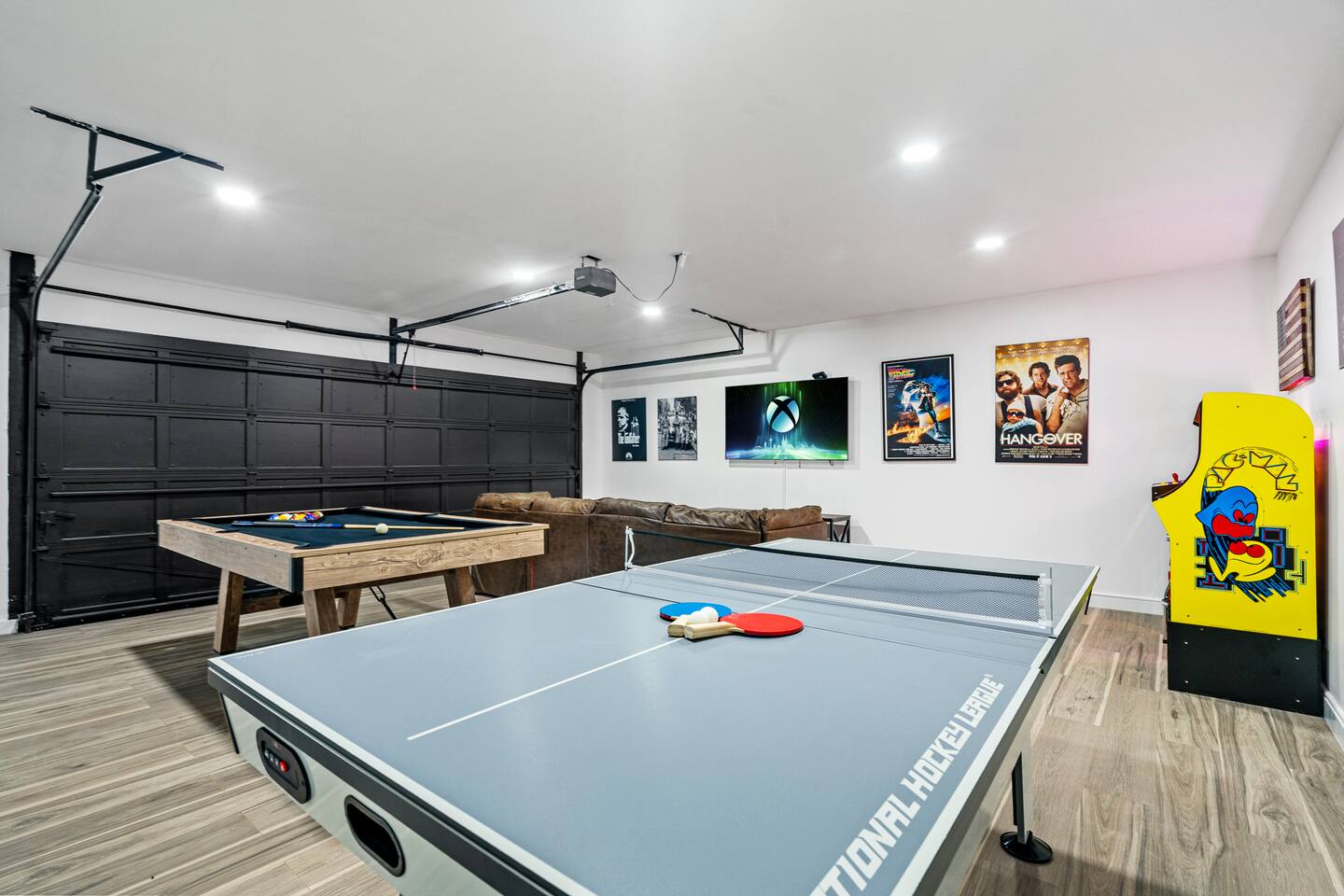 Our tropical retreat exudes a coastal charm with earthy tones and coastal-inspired decor. Recently renovated with four private bedrooms (with privacy locks) and 8 beds, we can accommodate up to 11 guests. The house's theme is centered around entertainment, health and wellness (did we mention we have a Game Room in the garage?), promoting a balanced and relaxing environment for our guests. The tropical backyard retreat is fenced in with a covered patio and lounge chairs for sunbathing next to the FREE HEATED POOL, HOT TUB, SAUNA, BBQ Grill, Outdoor TV and COLD PLUNGE. Enjoy cocktails by the pool with plenty of shade or sun- whichever you prefer! Inside the retreat, an 85-inch smart TV is a central fixture in the expansive open-floor-plan (kitchen, living room, and dining room are all one open space), with access to Xfinity cable and streaming apps. The large dining room table can seat ten guests. There is a private laundry inside the garage Game Room with a brand new washer and dryer. We provide laundry detergent, dryer sheets, and an iron and ironing board. The garage Game Room features a big-screen TV, Xbox, pool table, ping pong, air hockey, and two arcade video game cabinets! Brand new central air conditioning and ceiling fans in every room keep the space cool, even during Florida’s hottest months, and our large ice machine on the patio is perfect for getting the cold plunge ready or keeping your drinks chilled on ice! We do allow up to 2 dogs. Please indicate at booking, and include the pet fee in your reservation. There is a smart lock for the front door for an easy self-check-in process. BEDROOMS: The Master Suite has a luxurious, plush king-size bed and ensuite private bathroom with a walk-in closet. The Master Bathroom has a double sink vanity and a large overhead rain shower with plenty of pressure. The two (2) Queen bedrooms feature cozy and extremely comfortable queen-sized beds, ideal for couples or solo travelers. The main bathroom has a shower with a tub and a large sink area. The Bunk Room is perfect for the kids or a group of friends, with five comfy beds (two bunk beds and a pull-out trundle). KITCHEN & INDOOR AMENITIES: The open kitchen has been updated with a new large kitchen island with barstools and Quartz counters. We have all the dishes, cups and glasses, utensils, cookware, appliances, coffee maker, blenders, etc. Our cleaning team leaves you with a 5-star "hotel quality" finish (just check our reviews!), providing all sheets, pillows, towels, plenty of beach towels, laundry detergent pods, dishwashing pods, paper towels, toilet paper, hand soap, dish soap, plates, bowls, glasses, etc. If you are missing something that can make your stay more enjoyable, please do not hesitate to ask! OUTDOOR AMENITIES: Step into the backyard, where a private Bali-inspired paradise awaits! Relax and rejuvenate in the sparkling pool, soak up the Florida sun on the comfortable lounge furniture, or unwind in the hot tub. For those seeking wellness, our sauna and cold plunge offer the perfect way to detox and refresh your body. An outdoor shower adds a touch of convenience after a dip in the pool or a day at the beach. Don't forget, you can enjoy the game by the pool on our large outdoor smart TV! ENTERTAINMENT: The Game Room in the garage is a haven for entertainment enthusiasts, featuring a big-screen TV, Xbox video game system, pool table, ping pong/air hockey, and arcade video game cabinets. We have numerous board games for the whole family. Hours of fun await you and your guests right at home! LOCATION: Nestled in Palm Beach Gardens, you'll have easy access to pristine beaches, world-class golf courses, shopping, dining, and various outdoor activities. Spring training is just a stone’s throw away! The best of Palm Beach Island is also at your fingertips... Whether you're seeking relaxation or adventure, our Palm Beach Gardens Retreat offers the ideal space to create lasting memories with family and friends. Book your stay today and experience the perfect blend of health, wellness, and fun in paradise!