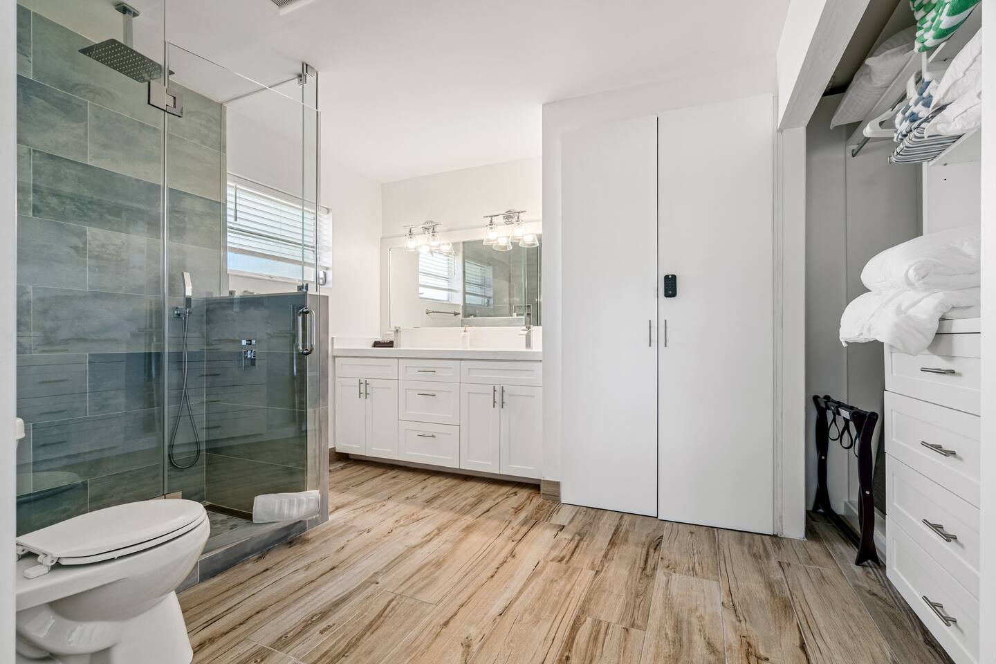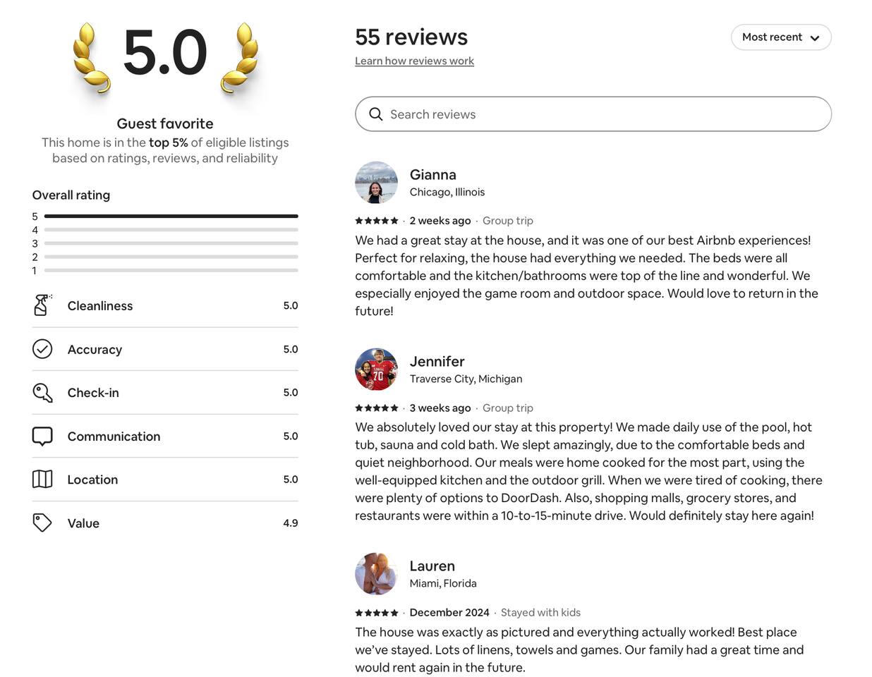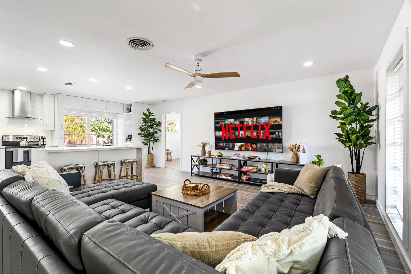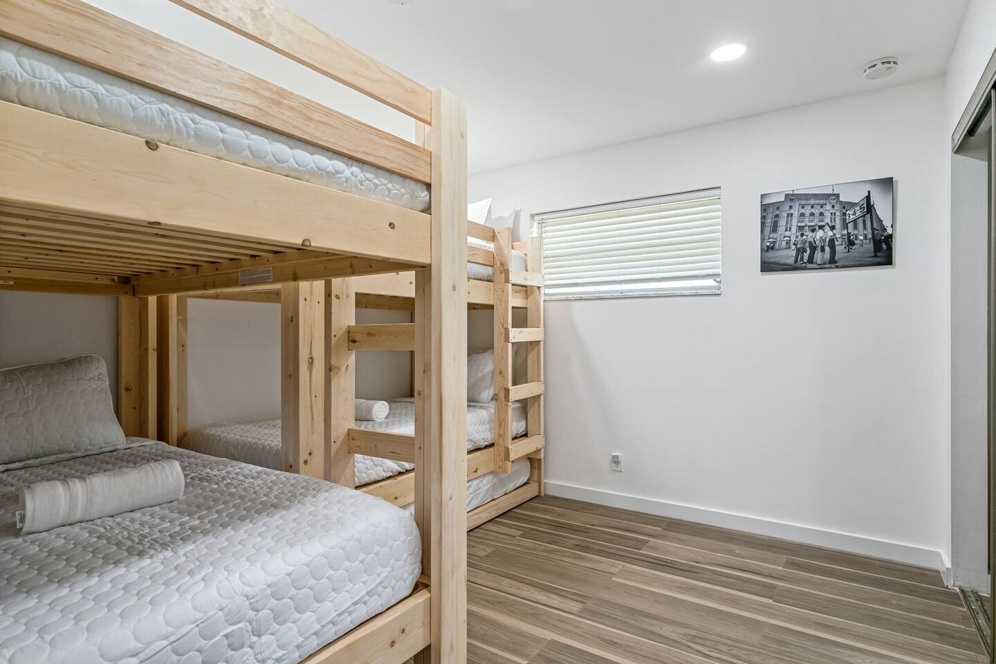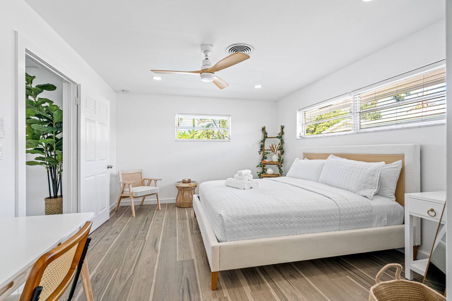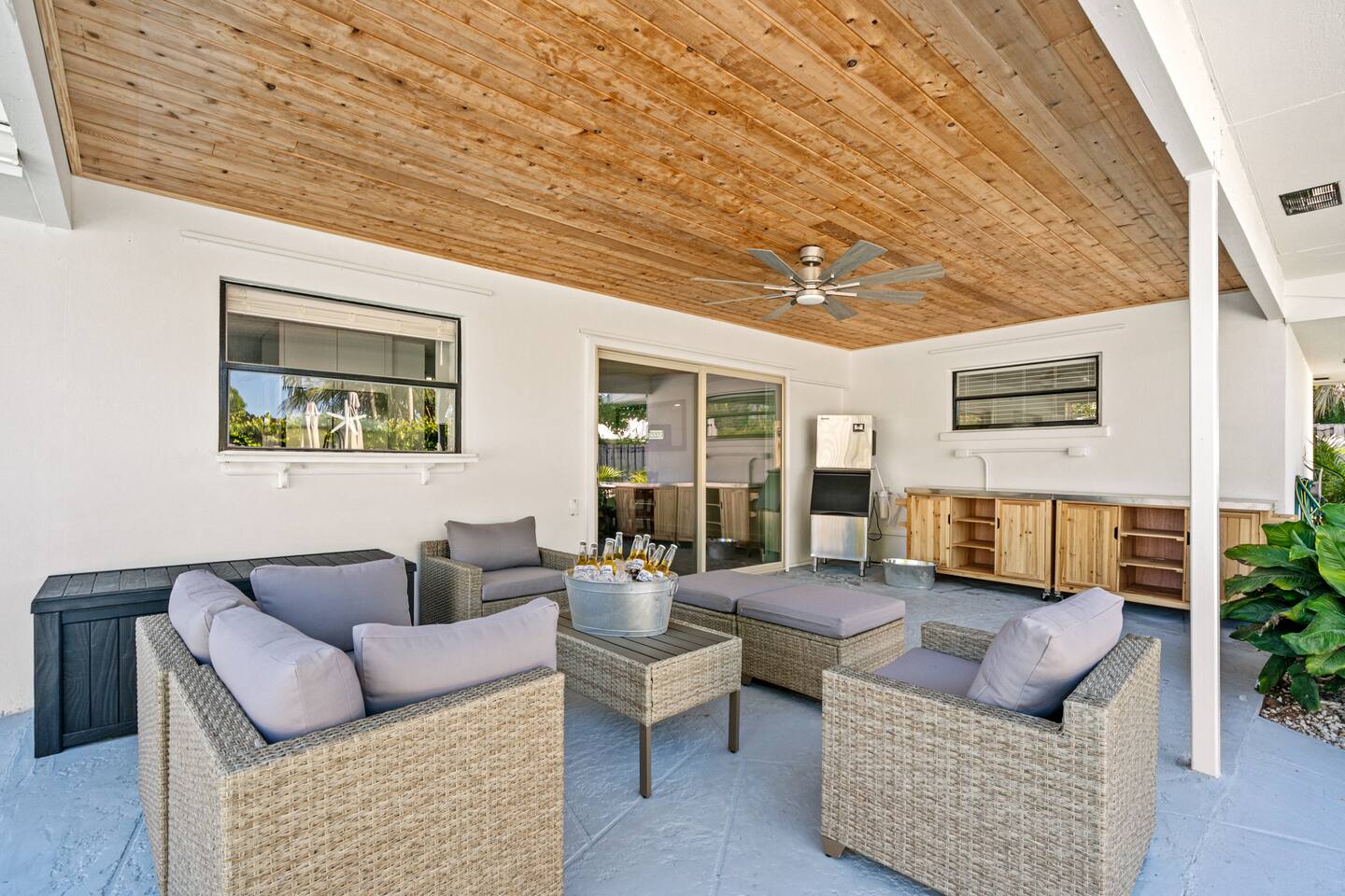 Our tropical retreat exudes a coastal charm with earthy tones and coastal-inspired decor. Recently renovated with four private bedrooms (with privacy locks) and 8 beds, we can accommodate up to 11 guests. The house's theme is centered around entertainment, health and wellness (did we mention we have a Game Room in the garage?), promoting a balanced and relaxing environment for our guests. The tropical backyard retreat is fenced in with a covered patio and lounge chairs for sunbathing next to the FREE HEATED POOL, HOT TUB, SAUNA, BBQ Grill, Outdoor TV and COLD PLUNGE. Enjoy cocktails by the pool with plenty of shade or sun- whichever you prefer! Inside the retreat, an 85-inch smart TV is a central fixture in the expansive open-floor-plan (kitchen, living room, and dining room are all one open space), with access to Xfinity cable and streaming apps. The large dining room table can seat ten guests. There is a private laundry inside the garage Game Room with a brand new washer and dryer. We provide laundry detergent, dryer sheets, and an iron and ironing board. The garage Game Room features a big-screen TV, Xbox, pool table, ping pong, air hockey, and two arcade video game cabinets! Brand new central air conditioning and ceiling fans in every room keep the space cool, even during Florida’s hottest months, and our large ice machine on the patio is perfect for getting the cold plunge ready or keeping your drinks chilled on ice! We do allow up to 2 dogs. Please indicate at booking, and include the pet fee in your reservation. There is a smart lock for the front door for an easy self-check-in process. BEDROOMS: The Master Suite has a luxurious, plush king-size bed and ensuite private bathroom with a walk-in closet. The Master Bathroom has a double sink vanity and a large overhead rain shower with plenty of pressure. The two (2) Queen bedrooms feature cozy and extremely comfortable queen-sized beds, ideal for couples or solo travelers. The main bathroom has a shower with a tub and a large sink area. The Bunk Room is perfect for the kids or a group of friends, with five comfy beds (two bunk beds and a pull-out trundle). KITCHEN & INDOOR AMENITIES: The open kitchen has been updated with a new large kitchen island with barstools and Quartz counters. We have all the dishes, cups and glasses, utensils, cookware, appliances, coffee maker, blenders, etc. Our cleaning team leaves you with a 5-star "hotel quality" finish (just check our reviews!), providing all sheets, pillows, towels, plenty of beach towels, laundry detergent pods, dishwashing pods, paper towels, toilet paper, hand soap, dish soap, plates, bowls, glasses, etc. If you are missing something that can make your stay more enjoyable, please do not hesitate to ask! OUTDOOR AMENITIES: Step into the backyard, where a private Bali-inspired paradise awaits! Relax and rejuvenate in the sparkling pool, soak up the Florida sun on the comfortable lounge furniture, or unwind in the hot tub. For those seeking wellness, our sauna and cold plunge offer the perfect way to detox and refresh your body. An outdoor shower adds a touch of convenience after a dip in the pool or a day at the beach. Don't forget, you can enjoy the game by the pool on our large outdoor smart TV! ENTERTAINMENT: The Game Room in the garage is a haven for entertainment enthusiasts, featuring a big-screen TV, Xbox video game system, pool table, ping pong/air hockey, and arcade video game cabinets. We have numerous board games for the whole family. Hours of fun await you and your guests right at home! LOCATION: Nestled in Palm Beach Gardens, you'll have easy access to pristine beaches, world-class golf courses, shopping, dining, and various outdoor activities. Spring training is just a stone’s throw away! The best of Palm Beach Island is also at your fingertips... Whether you're seeking relaxation or adventure, our Palm Beach Gardens Retreat offers the ideal space to create lasting memories with family and friends. Book your stay today and experience the perfect blend of health, wellness, and fun in paradise!